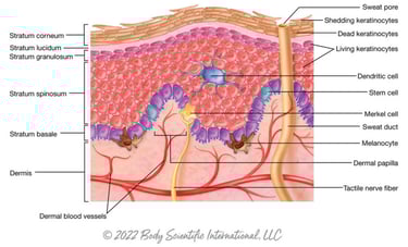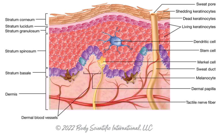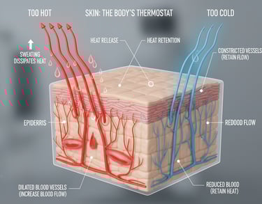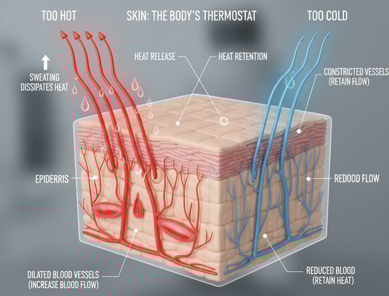 The skin is the body's "thermostat." When the body gets too hot, the skin helps dissipate heat through sweating. At the same time, blood vessels in the dermis dilate to increase blood flow, aiding in heat release. When the body is cold, these vessels constrict to reduce blood flow and retain body heat.