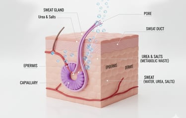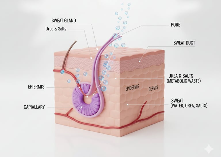 The skin helps the body excrete small amounts of metabolic waste, such as urea and excess salt, through sweat glands.