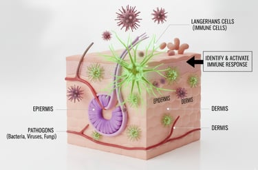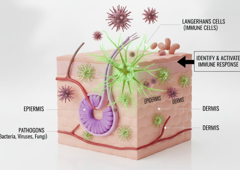 The skin contains immune cells like Langerhans cells, which act as the first line of defence for the immune system. When harmful substances attempt to invade, these cells can quickly identify them and activate an immune response, helping the body fight off infection.