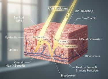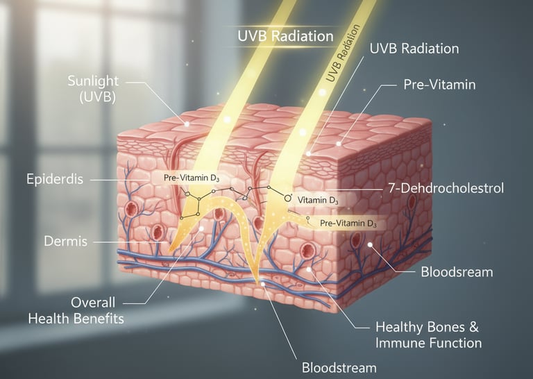 Under ultraviolet B (UVB) radiation from sunlight, the skin can synthesize Vitamin D. This vitamin is essential for bone health because it helps the body absorb calcium.